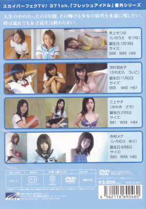 | 井上せつか B88・W65・H92 ※結構張りのあるオッパイをしています。 河村羽衣子 B85・W60・H87 三上サチ B81・W58・H84 市村メグ B80・W58・H80 スカイパーフェクトTV!371ch 「フレッシュアイドル」番外シリーズ 複数の女子高生が登場 制服、ブルマ、水着等でキレイな肌を露出しています。 発売:2003年 定価:3990円(税込) 太郎SHOP価格:1200円 |