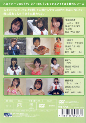 | 東海林由夏 B90・W56・H84 ※ウエストも細いのに凄い巨乳なんです。 七瀬桜子 B80・W57・H84 RIKO B82・W60・H88 藤田千夏 B85・W62・H90 スカイパーフェクトTV!371ch 「フレッシュアイドル」番外シリーズ 複数の女子高生が登場 制服、ブルマ、水着等でキレイな肌を露出しています。 発売:2003年 定価:3990円(税込) 太郎SHOP価格:1200円 |